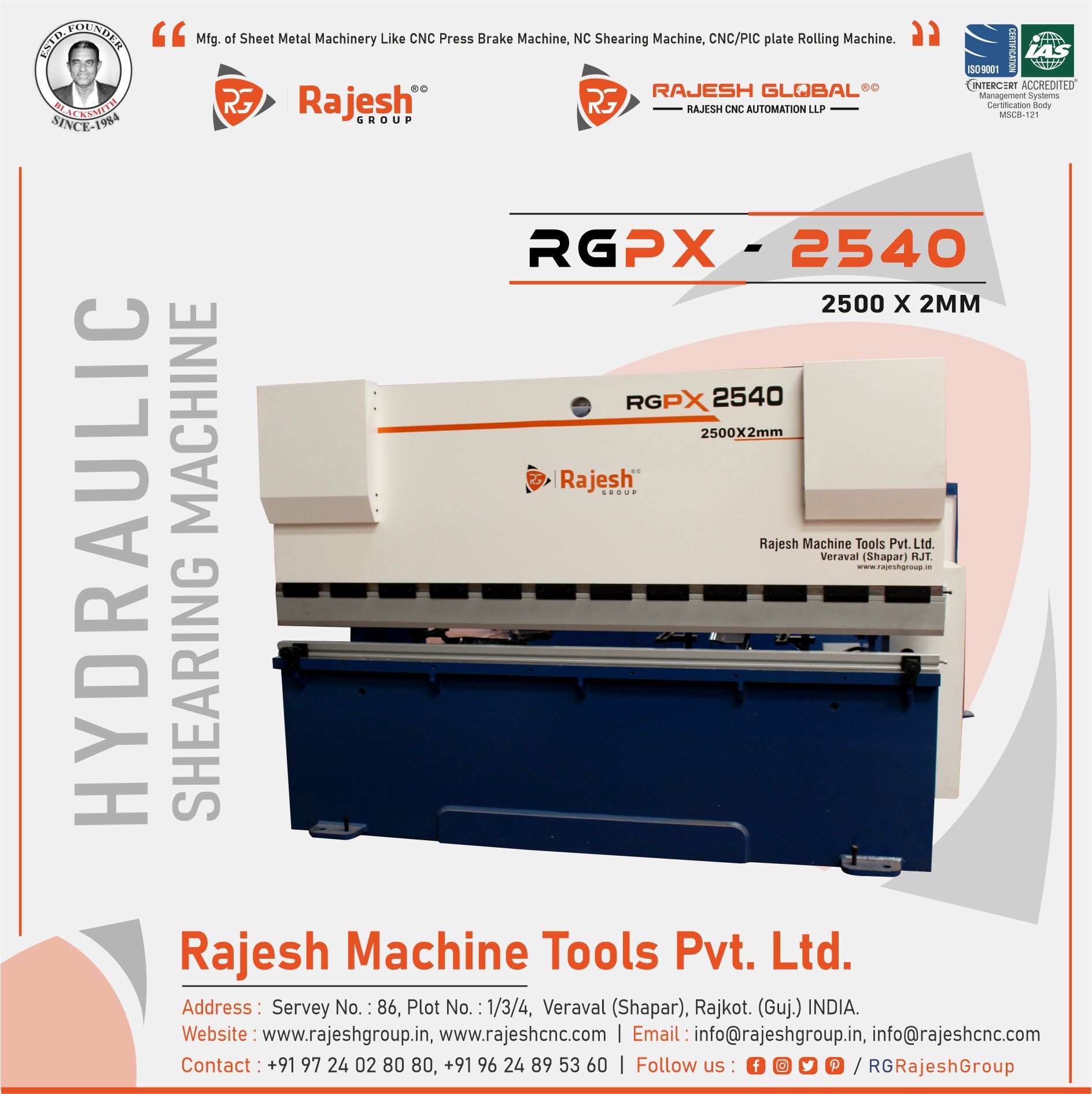 HYDRAULIC SHEARING MACHINE (Model : RGPX – 2540) Rajesh Machine Tools Pvt. Ltd. Address : Servey No. : 86, Plot No. : 1/3/4, Veraval (Shapar), Rajkot. (Guj.) IND. Website : www.rajeshgroup.in, www.rajeshcnc.com Email : [email protected], [email protected] Contact : +91 97 24 02 80 80, +91 96 24