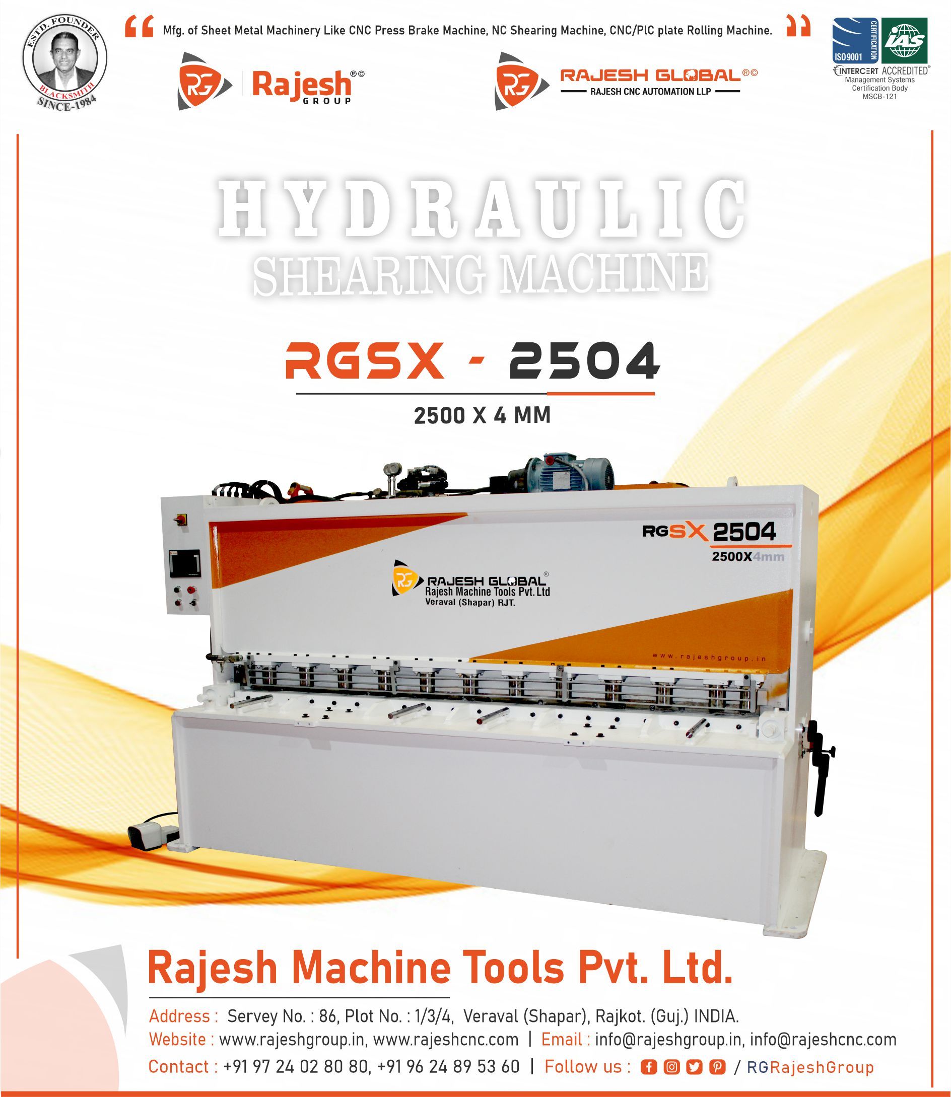 HYDRAULIC SHEARING MACHINE (Model : RGSX : 2504) Rajesh Machine Tools Pvt. Ltd. Address : Servey No. : 86, Plot No. : 1/3/4, Veraval (Shapar), Rajkot. (Guj.) IND. Website : www.rajeshgroup.in, www.rajeshcnc.com Email : [email protected], [email protected] Contact : +91 97 24 02 80 80, +91 96 24