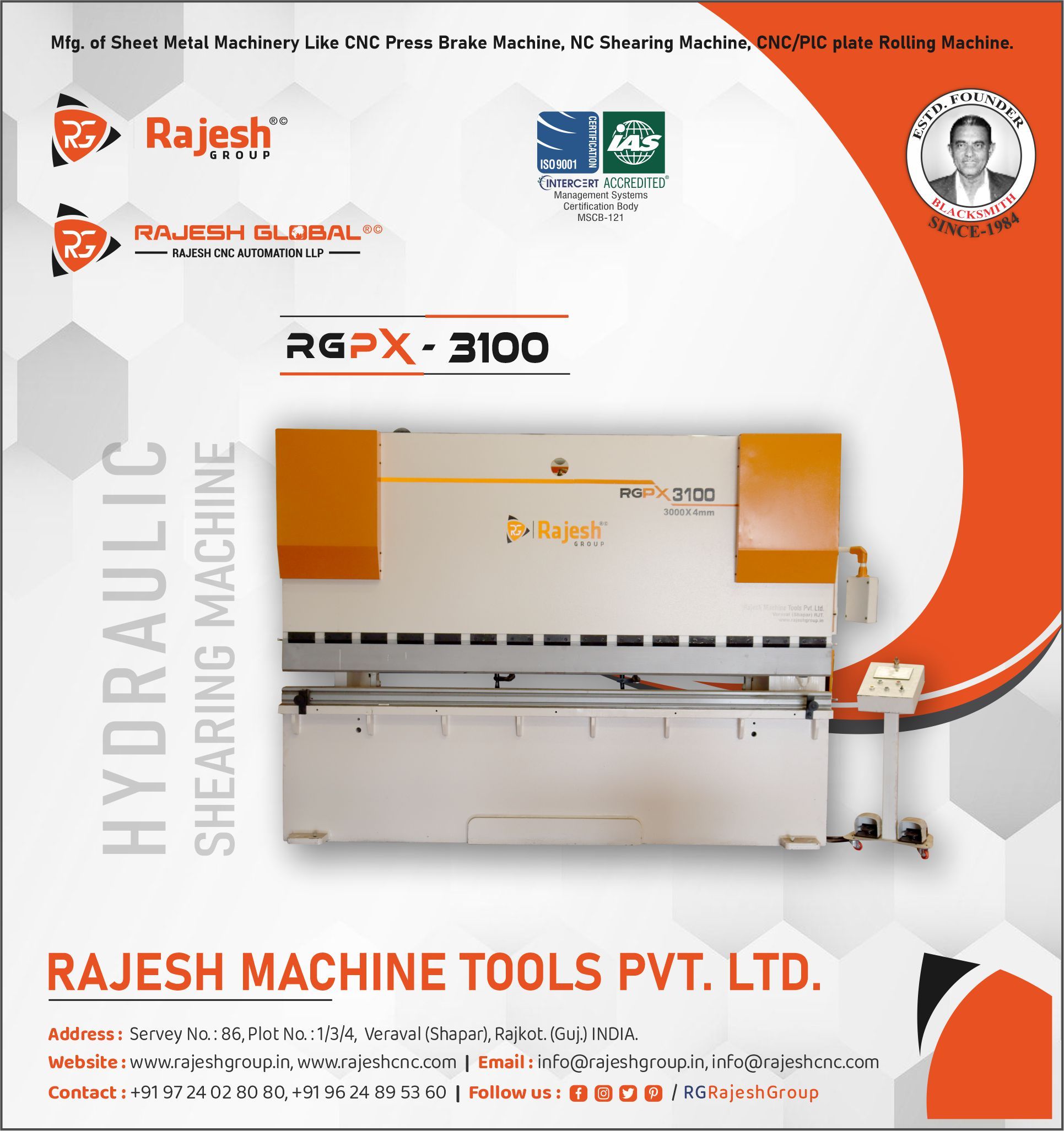 HYDRAULIC SHEARING MACHINE (Model : RGPX – 3100) Rajesh Machine Tools Pvt. Ltd. Address : Servey No. : 86, Plot No. : 1/3/4, Veraval (Shapar), Rajkot. (Guj.) IND. Website : www.rajeshgroup.in, www.rajeshcnc.com Email : [email protected], [email protected] Contact : +91 97 24 02 80 80, +91 96 24