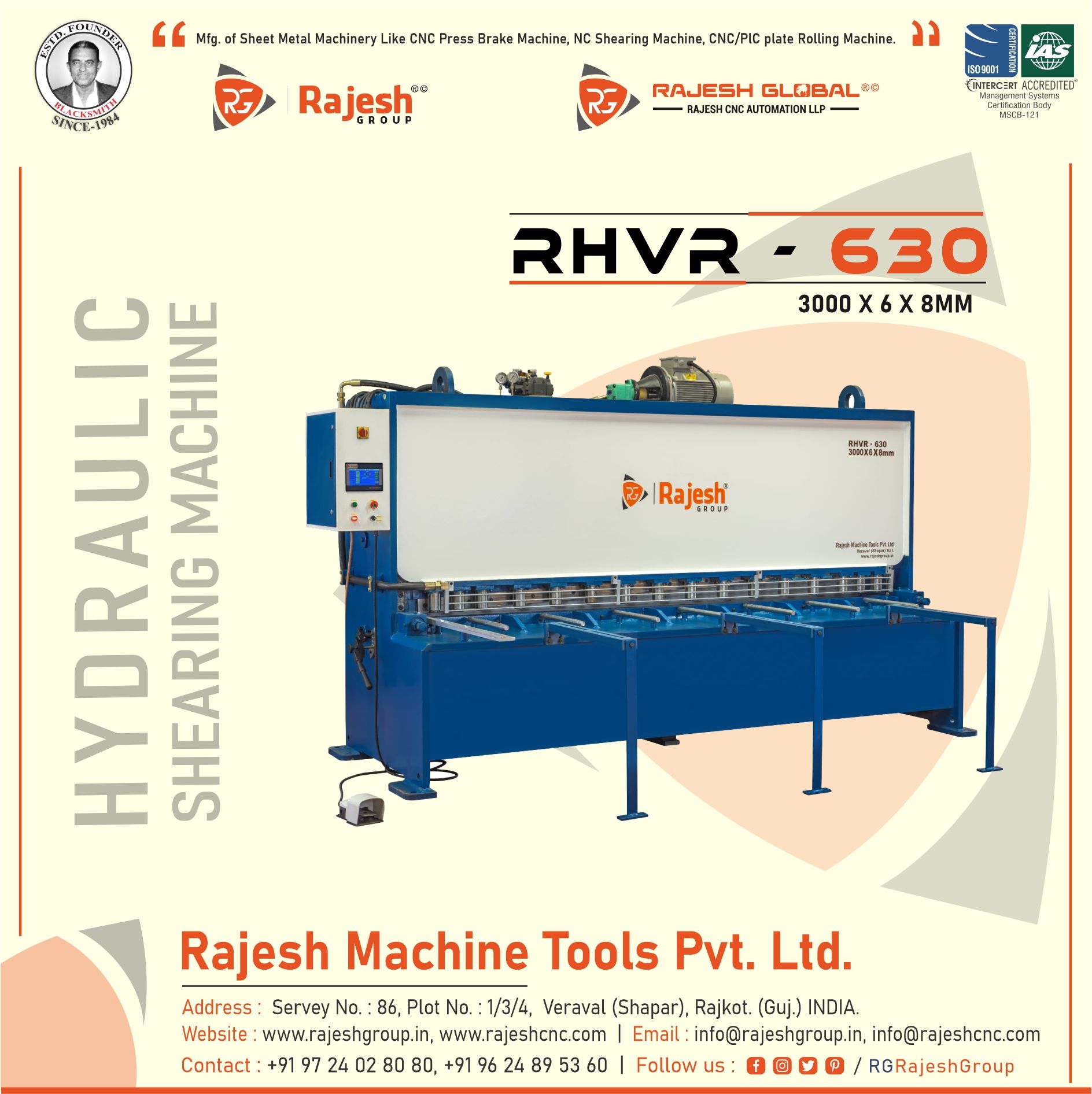 HYDRAULIC SHEARING MACHINE (Model : RHVR – 630) Rajesh Machine Tools Pvt. Ltd. Address : Servey No. : 86, Plot No. : 1/3/4, Veraval (Shapar), Rajkot. (Guj.) IND. Website : www.rajeshgroup.in, www.rajeshcnc.com Email : [email protected], [email protected] Contact : +91 97 24 02 80 80, +91 96 24