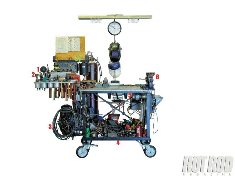 1.Our favorite mod is the aluminum accessory rack that holds the air tools: seven die grinders with diferent attachments, three reciprocating saws, a disc sander, and a right-angle drill. No digging through the toolbox and wasting time swapping attachments for this guy. he just grabs the grinder with the tool he needs and goes to work. 2. The sides of the cart carry all the ancillary drilling, cutting, and welding tools. 3. Andrew made fixed mounts for a gas cylinder and a miller dynasty 200 tIG