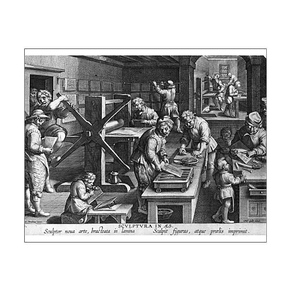 10×8 Inch (25x20cm) Print. All the stages involved in the art of engraving and printing from the prepared plates using a large press, at a print works, circa 1600. Original Artwork: Engraving by J Stradenus (1523 – 1605). (Photo by Hulton Archive/Getty Images). 1 5 h boo prin machine hand earlydate, 1318, 1600 h, 2637788, format, landscape machinery bench tool male child sitting industrious eu. Image supplied by Fine Art Storehouse. Product ID:dmcs_11803092_676_0
