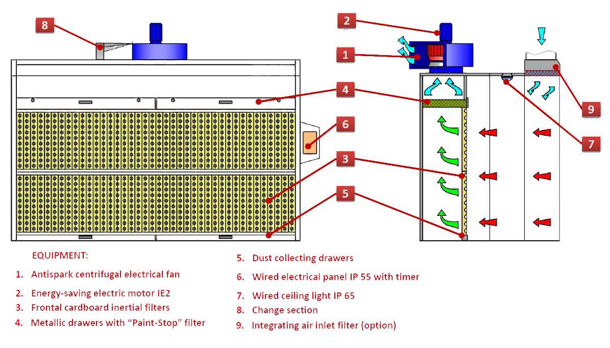 This type of spray painting booth is suitable for suction and removal of pigments and fumes emitted from paint spray made with synthetic solvents, organic water. The removal of the pigments and fumes occurs with a suctioning wall of cardboard media and a second filtration with ¡?Paint-Stop¡? filters drawers.