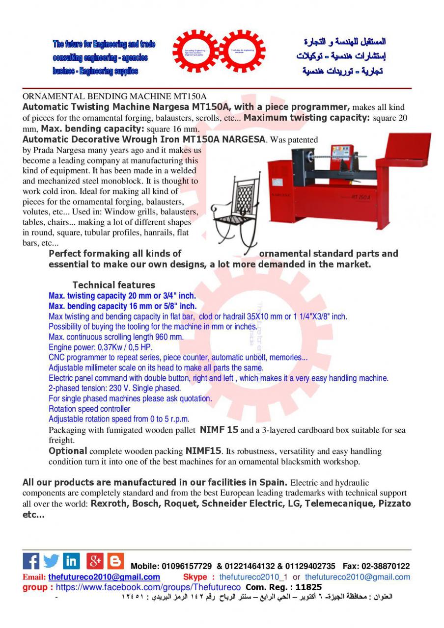 BENDING MACHINE MT150A PRADA NARGESA S.L. more than 40 years experience in the branch of manufacturing industrial machinery: Profile formers, Hydraulic Punching machines, Forging Machines; propane furnaces, Hydraulic Press brakes, Shears, Broaching machines, Weld Positioners, etc. For more information please call us “The future for engineering and Trade” in Egypt tel.: 00201096157729 & thefutureco2010@g…