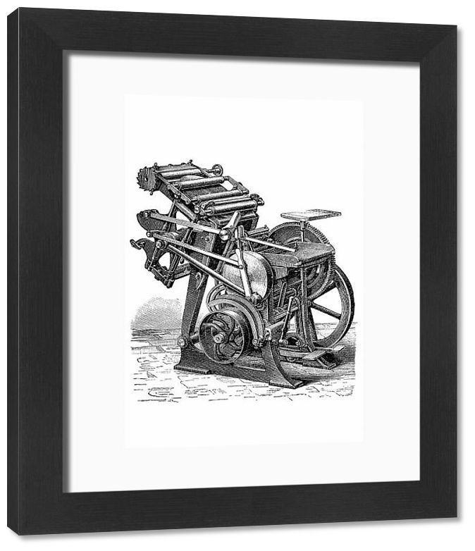 33×28 cm frame with high quality print. Antique illustration of printing press typography machine. factory, machinery, monochrome, newspaper, automatic, journalism, printout, machine part, printing press, the media, manufacturing equipment, typescript, printing out, printing plant, 499913746. Image supplied by Fine Art Storehouse