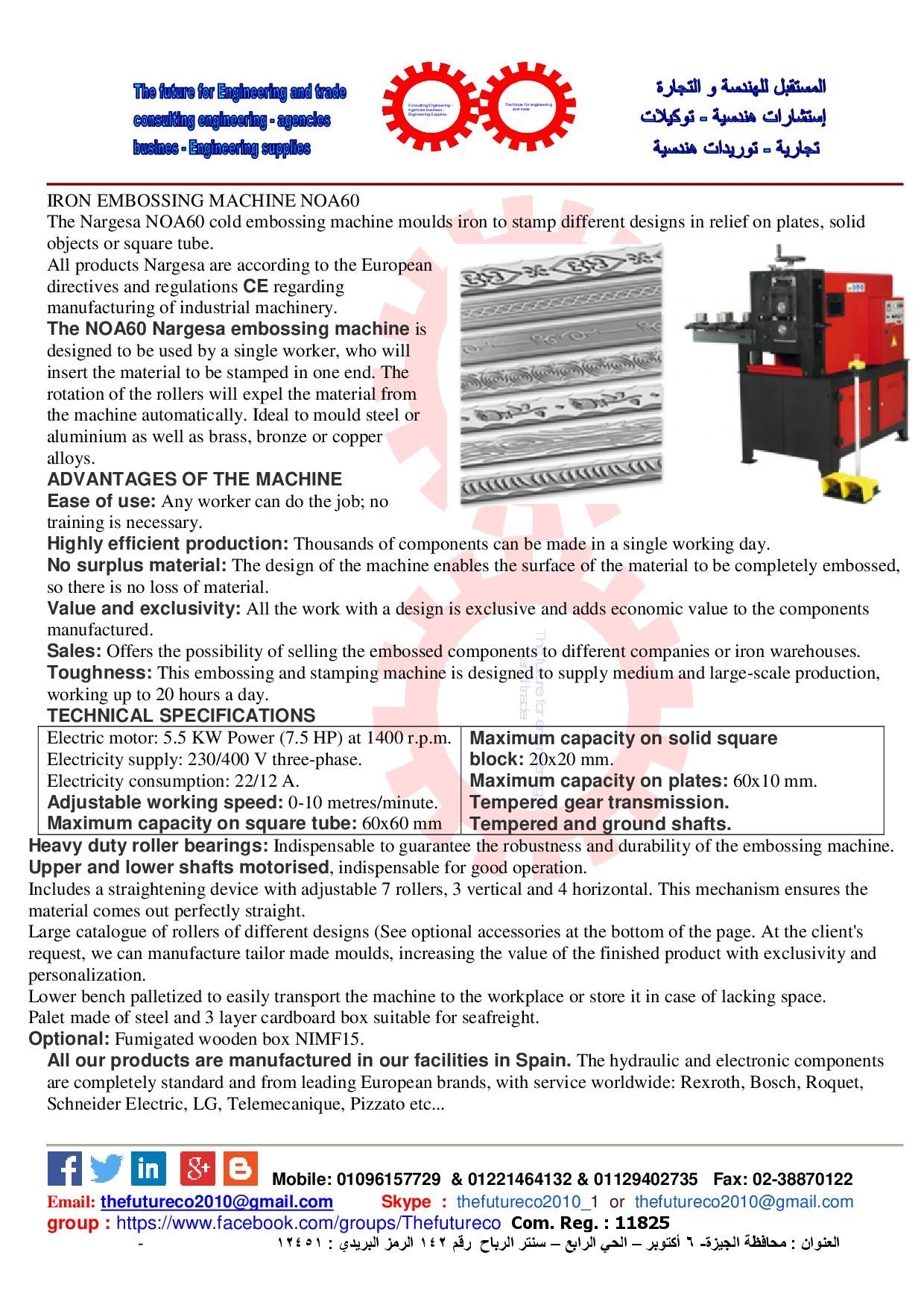 IRON EMBOSSING MACHINE PRADA NARGESA S.L. more than 40 years experience in the branch of manufacturing industrial machinery: Profile formers, Hydraulic Punching machines, Forging Machines; propane furnaces, Hydraulic Press brakes, Shears, Broaching machines, Weld Positioners, etc. For more information please call us “The future for engineering and Trade” in Egypt te.: 00201096157729 & thefutureco2010@g…