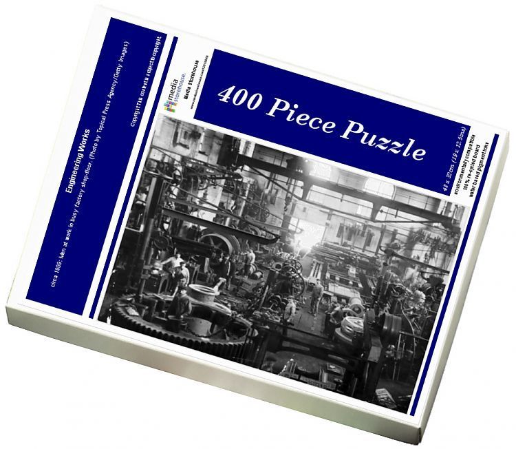 400 Piece Jigsaw Puzzle. circa 1909: Men at work in busy factory shop-floor. (Photo by Topical Press Agency/Getty Images). factory, engineering, machinery, manufacturing, busy, machine part, industrial equipment, used, shop floor, h ind fact, top 017241, 3401160, england black white format landscape male machinery industrial machinery mechanism manufacturing europe top 017241 h ind fact, england black and white format landscape male machinery industrial machinery mechanism manufacturing europe top 017241 h ind fact. Image supplied by Fine Art S