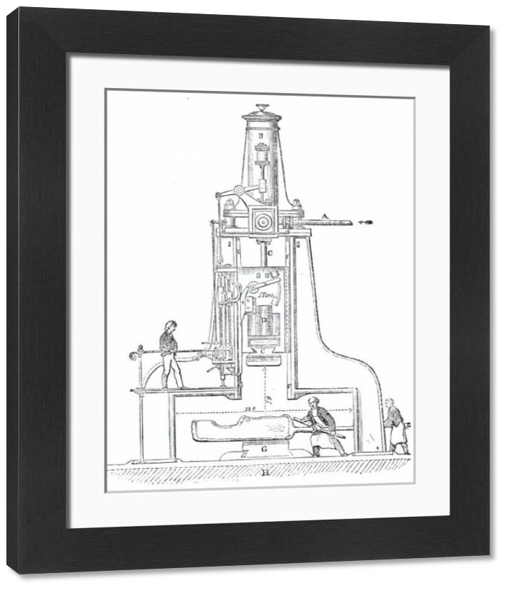 58×48 cm frame with high quality RA4 print made In Australia. Nasmyth’s patent steam hammer, 1844. Diagram of the …novel machine, which has just been set to work at the Royal Dock-yard, Devonport [in Devon], for the purpose of forging in the most rapid and perfect manner all descriptions of large wrought iron-work required for the naval service. The machine is Mr. James Nasmyth’s Patent Direct-action Steam Hammer, by means of which, no mass of wrought iron, however large, is beyond the compass of its powers; while such is its managability, th