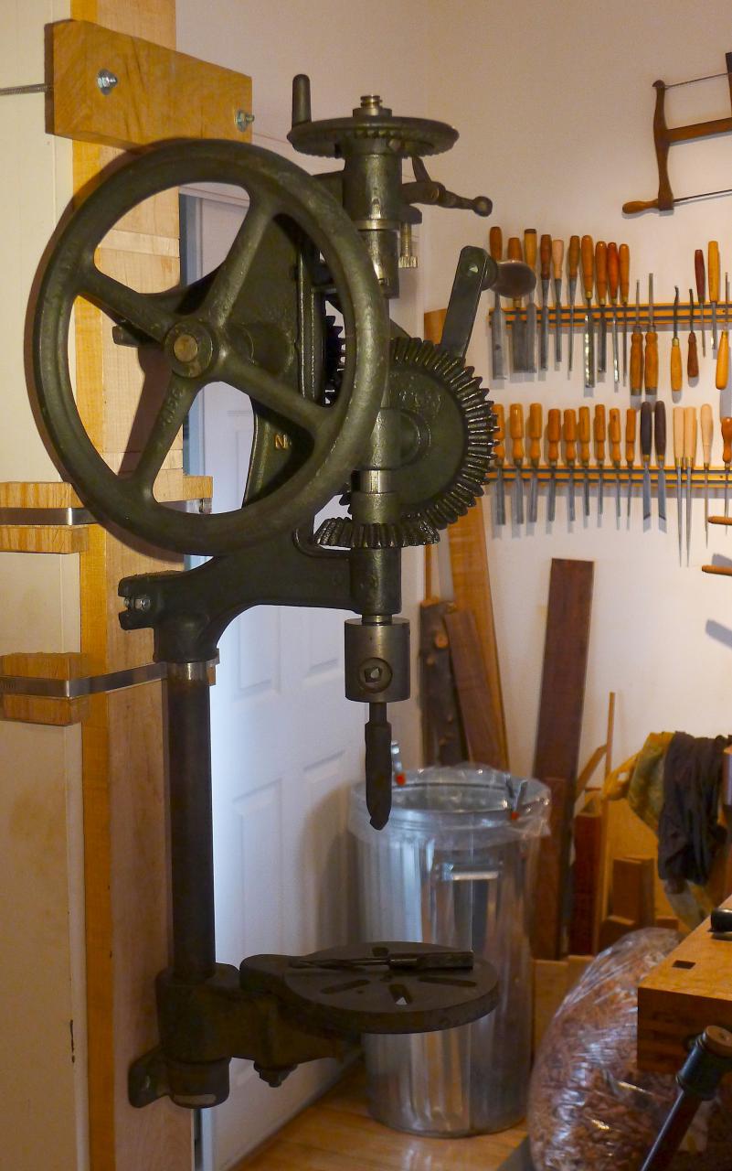 The Canadian Blower & Forge Co., Ltd. post hand crank drill press no. 61. Made as of 1915 in Kitchener, Ontario. And yes, you can drill thick steel plates with it. www.facebook.com/julienhardydesign